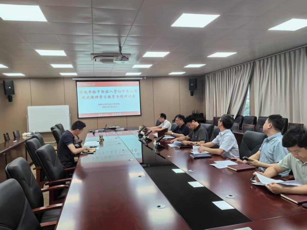 为深入贯彻中央八项规定精神学习教育,5月23日,物电学院党委召开年轻干部开展深入贯彻中央八项规定精神学习教育专题研讨会。学院党委书记秦勤忠主持会议,学院党委委员和全体年轻干部参加学习。 学院党委书记秦勤忠领学了习近平总书记关于深入贯彻中央八项规定精神学习教育的重要讲话精神,他指出中央八项规定是新时代我们党自我革命的“破题之笔”,学院全体党员干部必须深刻领会其政治内涵,始终保持清醒认识,筑牢思想防线。 随后与会人员一同观看了警示教育片。学院年轻干部观看警示教育片后逐一发言。黄嘉指出作为年轻干部要破除功利思维,校准政绩观,锤炼政治慧眼,把准方向舵。夏琳表示教育是播种希望的沃土,绝不容贪腐的淤泥污染,我们要以敬畏之心对待每项权力。 秦勤忠最后强调,作风建设永远在路上,年轻干部是学院事业发展的主力军,更要时刻绷紧反腐倡廉这根弦,警钟长鸣。学院将以此次学习为契机,继续深化党风廉政教育,压紧压实主体责任,以优良党风引领院风、教风、学风,为学院高质量发展提供坚强政治保障。 现场图片(一) 现场图片(二) 现场图片(三) (一审:夏琳,二审:蒋琼,三审:秦勤忠)