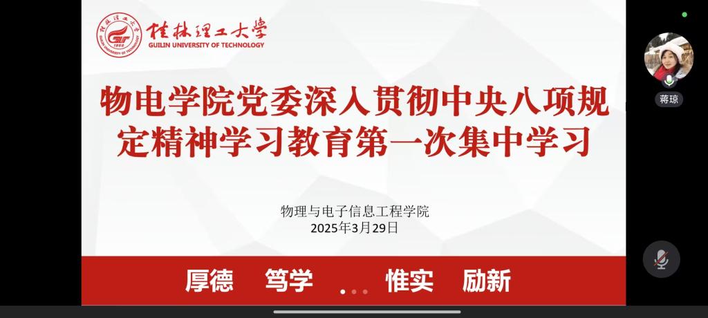 3月29日上午,77779193永利官网集团党委深入贯彻中央八项规定精神学习教育读书班通过腾讯线上会议正式开班。学院党委书记秦勤忠主持深入贯彻中央八项规定精神学习教育第一次集中学习,院长董明刚、党委副书记蒋琼分别作专题发言,学院领导班子成员、纪委委员及各基层党支部书记参加会议。 学院党委书记秦勤忠领学《中央八项规定》并作系统解读。指出中央八项规定作为新时代全面从严治党的重要制度遵循,要通过深化学习教育推动作风建设常态化长效化。他强调,学院党委应重点落实学习教育、自查自纠和监督检查三项举措,开展深入贯彻中央八项规定精神学习教育,推动党的作风建设持续向好。 董明刚院长结合习近平总书记在十八届中央纪委二次、三次全会上的重要讲话精神,深入阐释作风建设的长期性和重要性。他指出,要深入学习习近平总书记关于加强党的作风建设的重要论述,通过强化理论武装、开展案例警示教育、完善监督机制等方式,持续巩固学院风清气正的作风建设工作,确保中央八项规定精神落地生根。 蒋琼副书记重点传达中央党的建设工作领导小组会议精神,对学习班教育工作作出部署。她要求聚焦“学查改”一体推进,突出新提拔干部、年轻干部等重点群体分类指导。力戒形式主义,充分发挥学院各级党委对学院教育工作的责任制度和指导作用,通过坚持开门教育,完善制度规范、接受群众监督等举措,确保学习教育取得实效。 深入贯彻中央八项规定精神学习教育将通过党委理论学习中心组学习、专题党课、主题党日活动等多种形式持续进行。学院党委将以此次学习教育为契机,引导全体党员干部以高度政治自觉落实中央八项规定精神,以过硬作风推动学院各项工作再上新台阶。 会议图片 (一审:郭泉;二审:蒋琼;三审:秦勤忠)