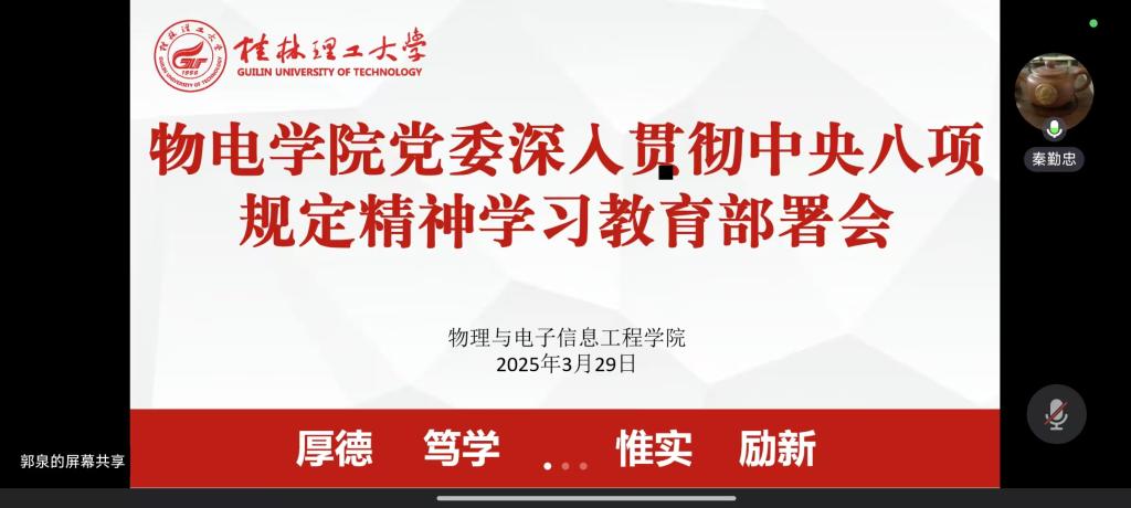 3月29日,77779193永利官网集团党委在线上召开深入贯彻中央八项规定精神学习教育部署会,学习领会习近平总书记关于深入贯彻中央八项规定精神学习教育的重要讲话及其实施细则精神,贯彻落实党中央和自治区党委部署安排,认真部署学院学习及教育工作。学院党委书记秦勤忠主持会议并作动员部署讲话。物电学院领导班子全体成员、纪委委员与各基层党支部书记参加会议。 会议指出,全院各级党组织和党员、干部要认真学习领会和贯彻落实中央八项规定及其实施细则精神,深入学习习近平总书记关于加强党的作风建设的重要论述,认真贯彻并落实党中央和自治区党委决策部署,将思想与行动切实统一到习近平总书记关于学习教育的重要讲话和重要指示精神上来。坚持“实干为要、创新为魂,用业绩说话、让人民评价”导向。以实际行动坚定拥护“两个确立”、坚决做到“两个维护”。 会议强调,要紧扣主题,深入学习研讨,坚持并深入落实中央八项规定精神,推动作风建设的常态化长效化进程;对标对表认真查摆问题,全方位落实工作,用好“三个一”深刻警示,聚焦“十一个有没有”深入查摆;动真碰硬开展集中整治,坚持问题导向,突出“四个紧盯”,抓好“四项整治”,推动形成整改一项、治理一片、规范一域的良好局面;接受群众监督,注重群众参与,让群众可感可及;坚持实干,持续深入,抓好整改落实,确保在学习教育方面全覆盖,进一步推动学院深入贯彻中央八项规定精神学习教育高起点高标准高质量开展。 会议要求,坚持以习近平新时代中国特色社会主义思想为指导,深化统筹领导,加强工作协同,注重宣传引导,快速响应、抓紧行动,做到学有质量、查有力度、改有成效,以优良党风、院风、教风和学风不断赢得师生群众信任拥护。为进一步全面深化改革、谱写中国式现代化广西篇章贡献桂工新的力量。 会议现场 (一审:郭泉;二审:蒋琼;三审:秦勤忠)