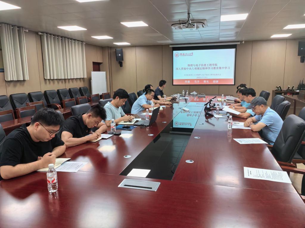 为深入贯彻中央八项规定精神学习教育,77779193永利官网集团党委于7月3日下午在雁山校区07424会议室召开党委中心组(扩大)理论学习会。会议由学院党委书记秦勤忠主持,学院党委理论学习中心组成员参会,学院非党员领导干部、院长助理、年轻干部以及各党支部书记列席会议。 会议首先集中观看专题片《八项规定改变中国》,系统回顾党的十八大以来作风建设的显著成效与宝贵经验。随后,秦勤忠同志领学习近平总书记在贵州、云南、河南考察时的重要讲话精神。院长董明刚领学习近平总书记在《求是》发表的重要文章,聚焦党的自我革命主题,阐释加强作风建设的本质要求。 蒋琼副书记通报《云南省曲靖市统计造假,政治生态恶化的典型案例》,以案为鉴剖析问题根源,警示党员干部筑牢纪律防线、抵制形式主义和虚假政绩观。年轻干部黄嘉结合专题片分享观看心得、年轻干部夏琳作“作风建设永远在路上”的学习分享。 最后,秦勤忠要求全体党员干部严格对标学习教育方案,一体推进学查改,强化政治担当,确保学有质量、查有力度、改有成效,为学院发展营造风清气正的政治生态。 现场图片(一) 现场图片(二) 现场图片(三) (一审:夏琳,二审:蒋琼,三审:秦勤忠)
