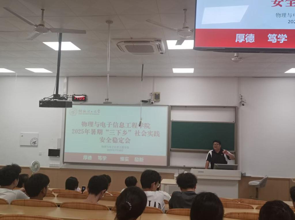 为切实做好“三下乡”实践团队的安全教育工作,确保实践活动的顺利完成,7月10日下午,我院在雁山校区04109教室开展2025年暑期“三下乡”社会实践活动工作部署会暨安全教育会,会议由学院辅导员郭泉主持,学院团委副书记王发,30名社会实践团队成员参加会议。