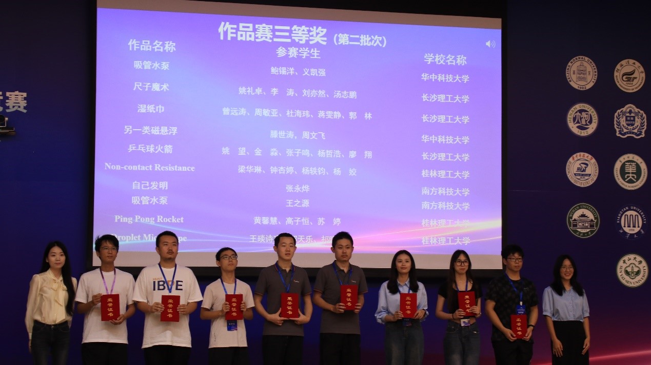 2024年7月23日,由中国大学生物理学术竞赛(CUPT)中南赛区委员会、华南理工大学共同主办的CUPT第七届中南赛区竞赛在华南理工大学落下了帷幕。由明星老师指导的《Non-contact resistance》(梁华琳、钟杏婷、杨轶钧、杨娇)、《Ping Pong rocket》(黄馨慧、高子恒、苏婷)、《Droplet microscope》(王琰诗琪、邹天乐、祁晓彤)三部作品被推荐到大赛组委会与来自中南地区的武汉大学、华中科技大学、中南大学、南方科技大学等19所高校43件作品同台竞技。2021级应用物理专业学生梁华琳、钟杏婷、2022级应用物理专业学生黄馨慧、2023级应用物理专业学生杨轶钧、2022级电子商务专业学生祁晓彤等同学现场参加了竞赛。经过评审我院三项作品最终均获三等奖。
