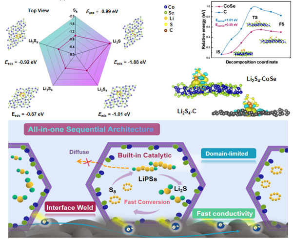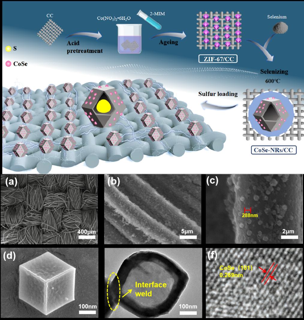 该研究采用原位策略构建了一种MOF衍生的内建CoSe催化剂的纳米反应器(NRs),同时通过界面耦合焊接在碳布(CC)上形成一体化串联结构(S@CoSe-NRs/CC)。内置CoSe催化剂的纳米反应器(CoSe-NRs)具有特殊的微环境和限域催化作用,可实现高效吸附、催化和沉积。CoSe-NRs与CC之间的焊接界面形成了一个连续而坚固的一体化导电网络。