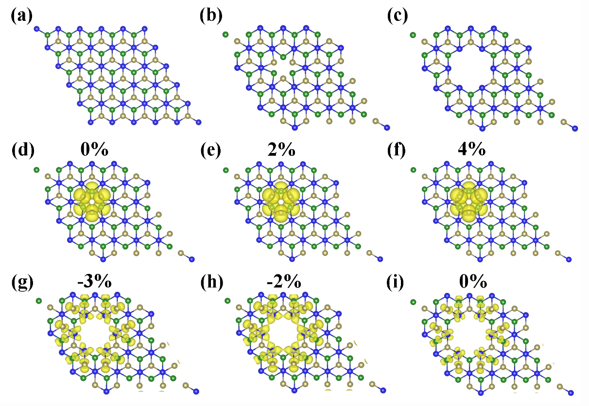 (a) α-Te的几何结构的俯视图,(b)优化的VTe1m缺陷结构的俯视图,以及(c)优化的VTe7缺陷结构的俯视图。在这些图中,黄色、蓝色和绿色球体代表上部、中部和下部的Te原子。(d-f)VTe1m和(g-i)VTe7的自旋密度分布,黄色等值面对应于正自旋密度。