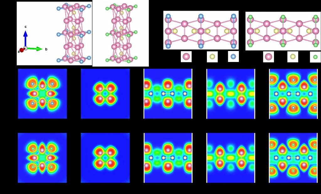 (a)和(b)为一维 Bi4RuX2的晶体结构和侧视图。(c)和(d)为一维Bi4RuI2和Bi4RuBr2的电子局域函数(ELF)切片图